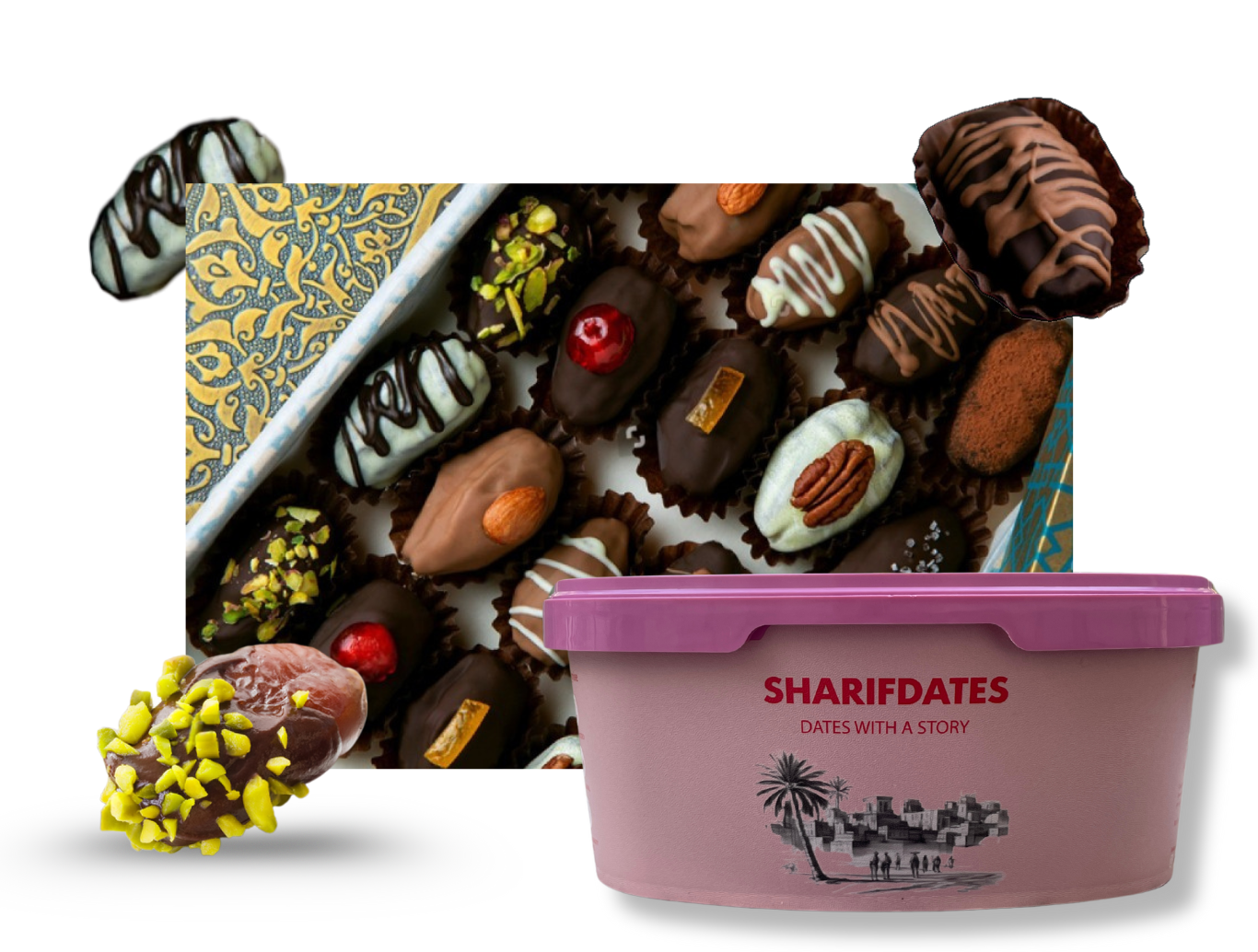 Finest Arabian Dates, double-coated in White and Milk Chocolate, bursting with fillings like Almonds, Pistachios, and rich gourmet blends.